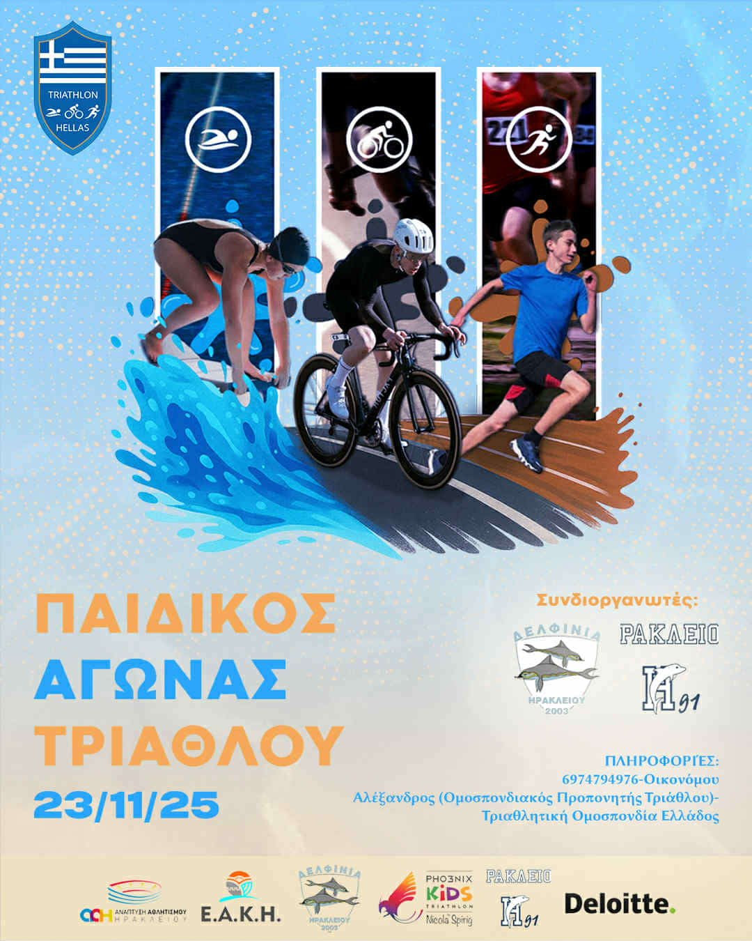 Η Τριαθλητική Ομοσπονδία Ελλάδας, σε συνεργασία με τα αθλητικά σωματεία "Δελφίνια Ηρακλείου" και "Ηράκλειο 91" και με την υποστήριξη της Πρωτοβάθμιας Εκπαίδευσης Ν. Ηρακλείου, του ΕΑΚ Ηρακλείου και του Δήμου Ηρακλείου (ΑΑΕΗΟΤΑ), θα πραγματοποιήσει παιδικό αγώνα τριάθλου, στα πλαίσια της δράσης για την ανάπτυξη του Τριάθλου «Pho3nix Kids Triathlon by Nicola Spirig».